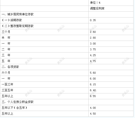 中国人民银行决定,自2012年7月6日起下调金融机构人民币存贷款基准利率。金融机构一年期存款基准利率下调0.25个百分点,一年期贷款基准利率下调0.31个百分点;其他各档次存贷款基准利率及个人住房公积金存贷款利率相应调整。