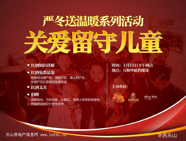 本周六,即1月12日下午2点,《新闻天天报》携手万和华庭共同举办的严冬送温暖系类活动——关爱留守儿童红酒义卖会,将在万和华庭售楼中心隆重举行。