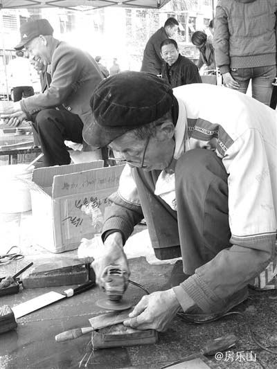 昨日上午10点,在便民服务现场,70岁的磨刀师傅杨春洪一边忙着磨刀,一边招呼着小区居民。而在杨师傅的身后已有二十来把菜刀在“排队”了。