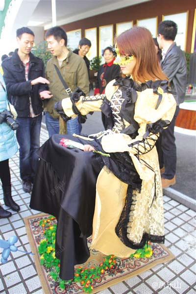 在立事达展位前,记者看到一位“牛人”模特正在进行悬浮表演。身穿法式宫廷服装、脸带羽毛面具、一只手拄着一根细小的柱子,盘腿悬浮于空中,不管周边的围观者在进行着何种猜想与感叹,模特始终表现“淡定”,一句话“不吊威亚、不走钢丝,姐靠的就是——内力!”另一边,在五洲汉唐的展区前美女模特正在进行“不倒翁”表演。在一根高达4米的细小柱子上、圆圆的球体内,美女模特正欢笑着和路过的观众打着“招呼”。“姐虽然没有内力,但姐有定力!在4米高的地方,姐也能左右摇摆、谈笑自如!”