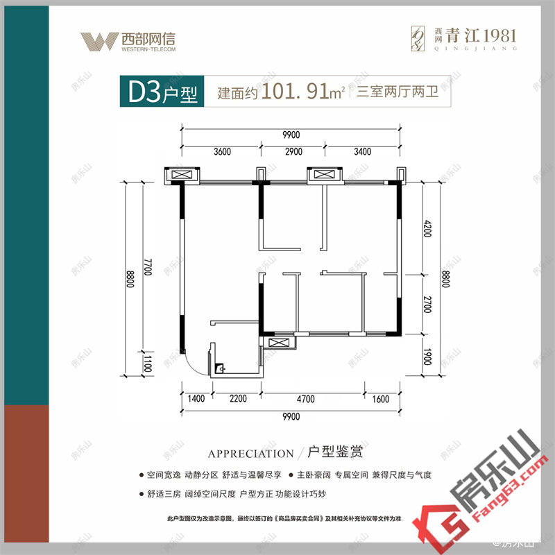 舒适三房,阔绰空间尺度,户型方正,功能设计巧妙。