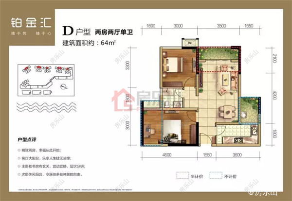 房乐山网经纪人点评户型: 铂金汇的户型比较多样,选择是很多的,从套二到套四均有。但随着一年来的热卖,现在套三户型比较紧俏了。最为让人眼前一亮的是铂金汇的D户型精装房,建面64平米实享80平米的小套二铂金汇采用精装的形式,均是采用名牌装修材料,品质有保证。再加上铂金汇项目本身环境就良好,适合居住,所以深得客户们的青睐。现在铂金汇销售进入了中后期阶段,房源也是不多,再加上准现房的优势,购房者们还是比较喜欢的。